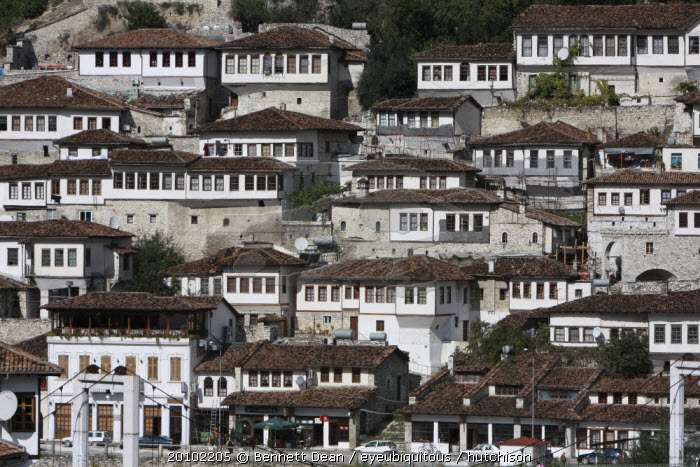 Albania, Berat, Ottoman houses in the old town with white painted exteriors and tiled roof tops.
