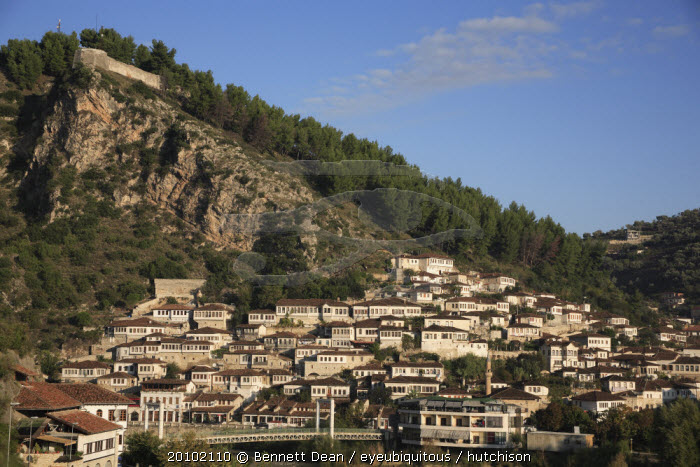 Albania, Berat, Traditional Ottoman buildings and footbridge over the river Osum.