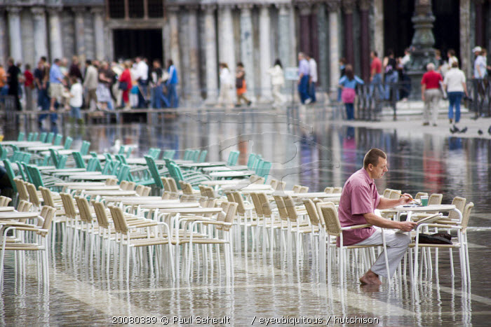 Aqua Alta High Water flooding in St Marks Square showing St Marks Basilica at the end of the flooded piazza with an artist painting a watercolour seated at a table in the water