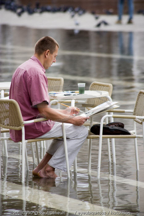 Aqua Alta High Water flooding in St Marks Square with an artist painting a watercolour seated at a table in the waterPaul Seheult