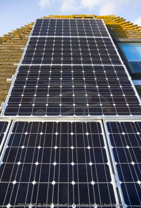 Architecture, Alternative Energy, Electricity, Solar photovoltaic roof panels on detached house for electricity conversion.