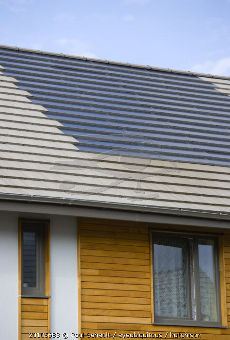 Architecture, Alternative Energy, Electricity, Solar photovoltaic roof tiles or slates on new houses by Linden Homes in Graylingwell Park.