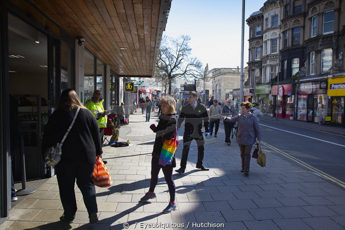 England, East Sussex, Brighton, People in queue with social distancing measures put in place by Waitrose supermarket to limit people entering the store.