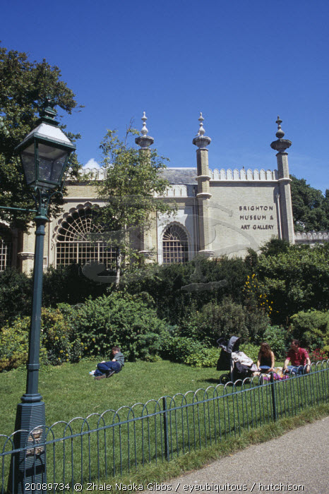 Brighton Museum and Art Gallery seen from The Royal Pavilion gardens with families sitting on the grass European Great Britain Northern Europe UK United Kingdom British Isles Pavillion