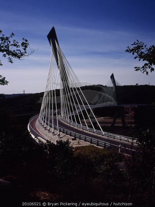 France, Bretagne, Finistere, Ile de Crozon. new pont de terenez suspension bridge view south from hillside above river aulne shows two lane carriageway and suspension supports.