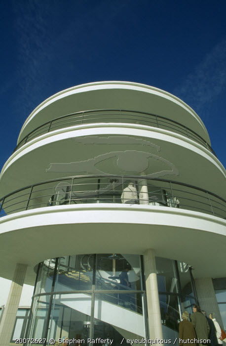 De La Warr Pavilion. Exterior detail view of the staircase section.Art Deco building built by the Earl Of De La Warr in 1935 Designed by Erich Mendelsohn and Serge Chermayeff Recently restored 2005 Grade One listed building European Great Britain Northern Europe UK British Isles History Pavilion Single unitary United Kingdom One individual Solo Lone Solitary Pavillion
