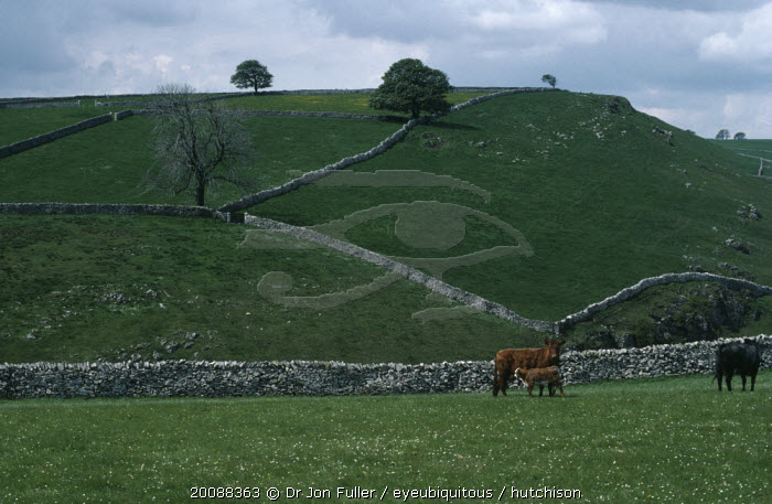 Dovedale. Pastureland divided by dry stone walls with cattle and calf in foreground.Cow Bovine Bos Taurus Livestock European Farming Agraian Agricultural Growing Husbandry Land Producing Raising Great Britain Northern Europe Scenic UK United Kingdom Agriculture British Isles Cows Female
