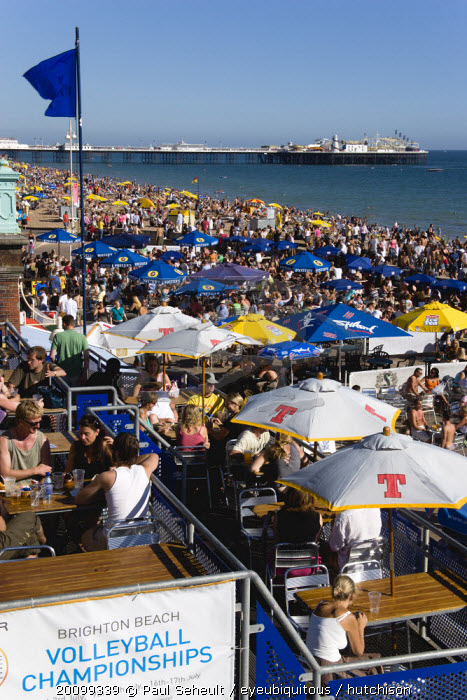 England, East Sussex, Brighton, People sitting under sun shade umbrellas at tables on the promenade outside bars and restaurants with Brighton Pier and people on the shingle pebble beach beyond.
