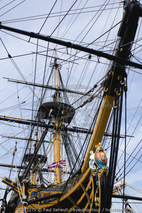 ENGLAND, Hampshire, Portsmouth, Bow and rigging of Admiral Lord Nelson's flagship HMS Victory showing the ship's figurehead in the Historic Naval Dockyard.