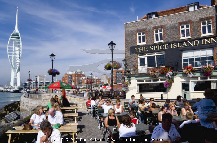 ENGLAND, Hampshire, Portsmouth, Harbour with the 170 metre tall Spinnaker Tower seen from the Spice Island Inn public house with people sitting at tables in Bath Square outside the pub.