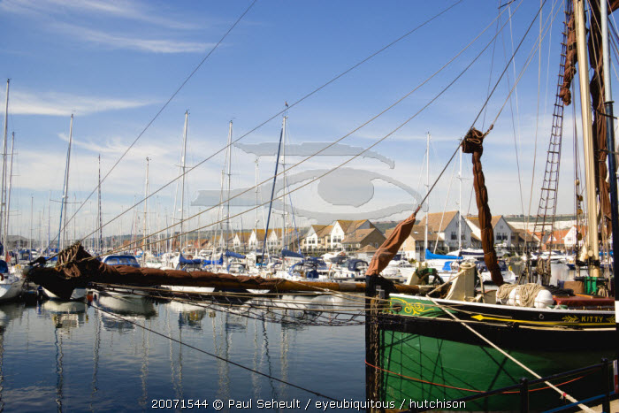England, Hampshire, Portsmouth, Port Solent Sailing barge SB Kitty moored in the marina with yachts and housing beyond.