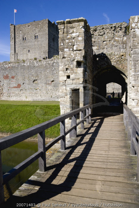 England, Hampshire, Portsmouth, Portchester Castle showing the Norman 12th Century Tower and 14th Century Keep beyond bridge over the moat built within the Roman 3rd Century Saxon Shore Fort.