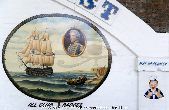 ENGLAND, Hampshire, Portsmouth, Wall paintings outside a tattooist's parlour underneath railway arches at Portsmouth Harbour Station showing a sailor with the local football club slogan Play Up Pompey and an old painting of Admiral Lord Nelson and the harbour.
