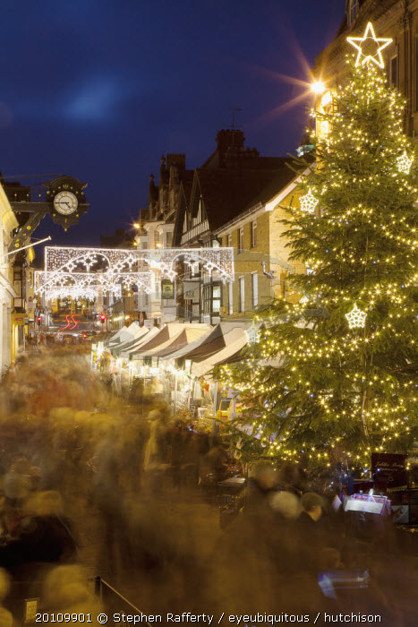 England, Hampshire, Winchester, High street decorated with Christmas tree and decorations, seen from the Buttercross.