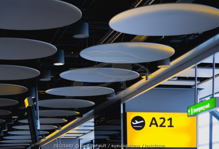 England, London, Heathrow Airport Terminal 5 disc ceiling in departures zone with passengers waiting in seating area at gate.