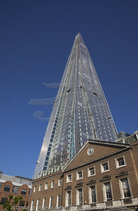 England, London, Southwark southbank, The Shard skyscraper designed by Renzo Piano in the city's London Bridge Quarter, seen from Guys Hospital.