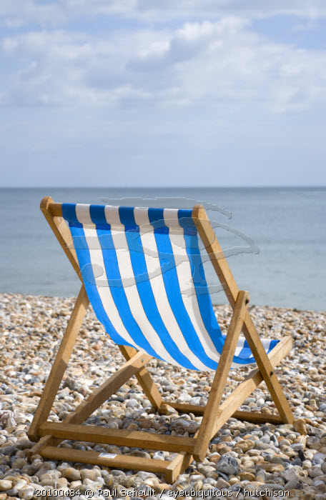 England, West Sussex, Bognor Regis, Single blue and white deck chair on the shingle pebble beach looking out to sea.