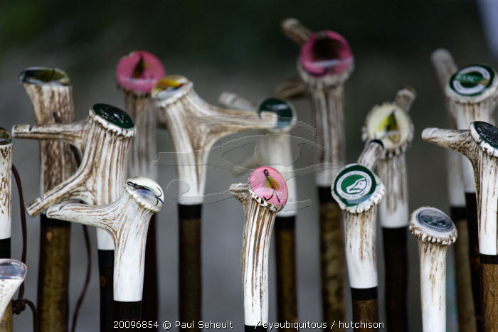 Findon village Sheep Fair Display of bone handled walking sticks with fly fishing hooks set into acrylic on the handles.Great Britain Northern Europe UK United Kingdom British Isles European