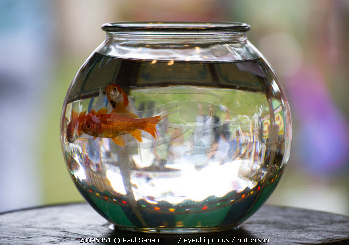 Findon village Sheep Fair Two Goldfish in a bowl on a fairground stall with people in the background inverted in the glass bowl.Great Britain Northern Europe UK United Kingdom British Isles European