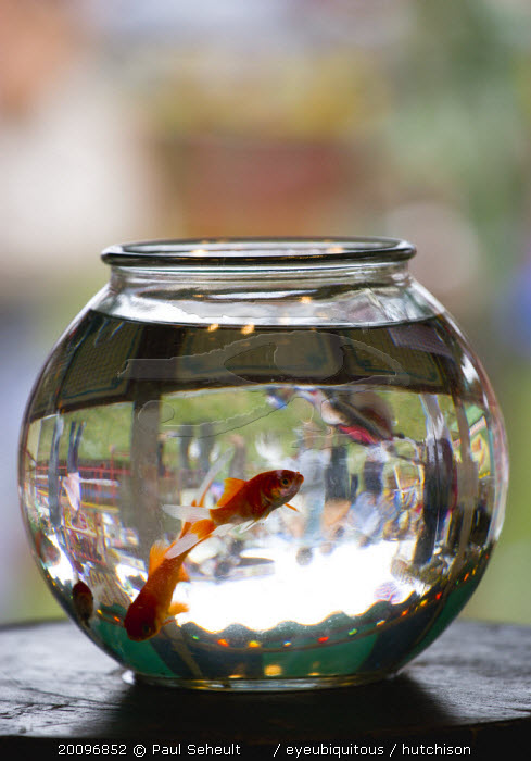 Findon village Sheep Fair Two Goldfish in a bowl on a fairground stall with people in the background inverted in the glass bowl.Great Britain Northern Europe UK United Kingdom British Isles European