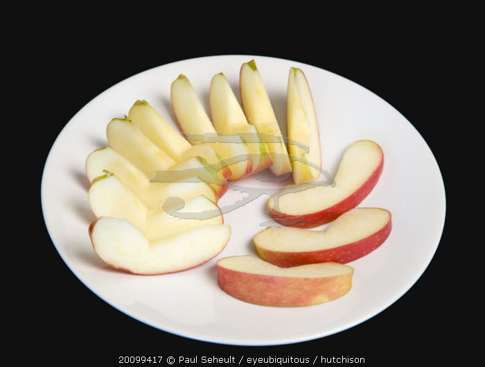 Food, Fruit, Apples, Slices of ripe apple on a white plate.