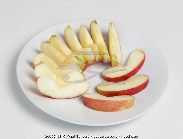 Food, Fruit, Apples, Slices of ripe apple on a white plate.