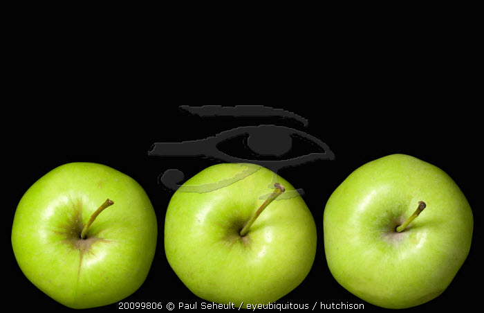 Food, Fruit, Apples, Three ripe green apples in a line seein from above showing the storks or stems against a black background.
