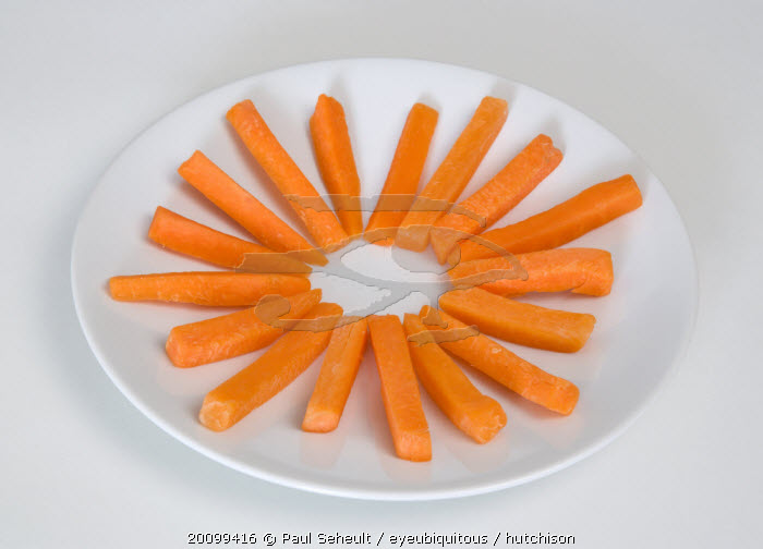 Food, Vegetable, Carrots, Slices of raw uncooked carrot on round white plate against a white background.