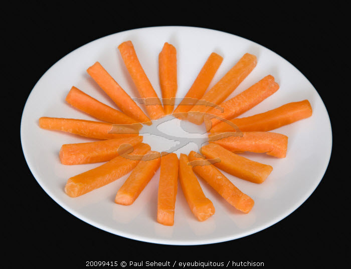 Food, Vegetables, Carrots, Slices of raw uncooked carrot on a white plate against a black background.