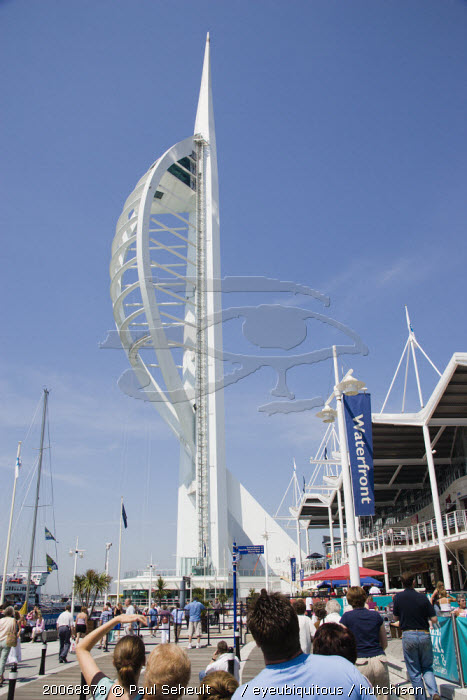 The Spinnaker Tower the tallest public viewing platforn in the UK at 170 metres on Gunwharf Quay with people on the waterfront area