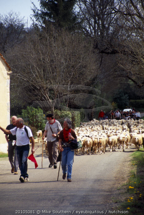 France, Transhumance, Seasonal movement of people with their livestock to summer pastures. Leading flock of sheep along rural road past buildings.