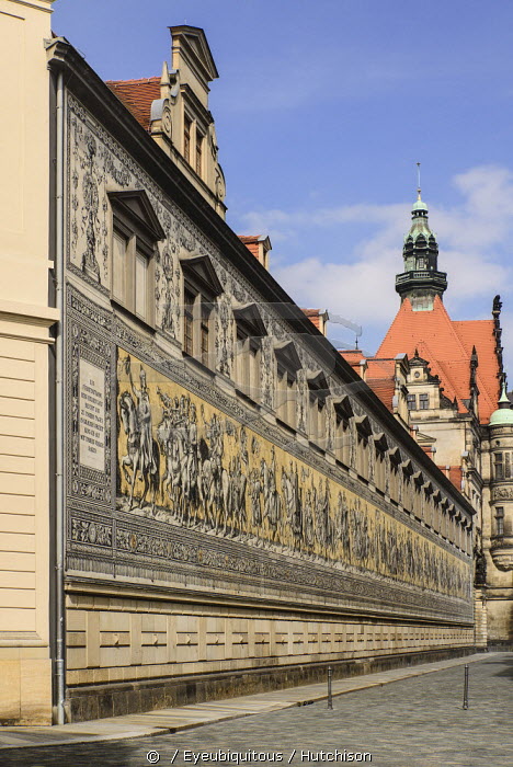 Germany, Saxony, Dresden, Furstenzug or Procession of Princes in Augustusstrasse a mural of 25,000 Meissen tiles that depicts 35 noblemen from the 12th century Konrad the Great to Friedrich August III Saxony's last king who ruled from 1904-1918. It was originally painted by Wilhelm Walther between 1870 and 1876 but eventually, the stucco began to crumble and between 1904-07 it was replaced by the tiles.