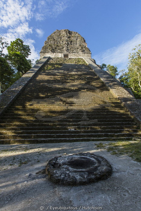 Guatemala, Temple V, a ruin in the archeological site of the ancient Mayan culture in Tikal National Park, Sacrificial altar in the foreground, UNESCO World Heritage site, Temple V was built around 700 AD in the Late Classic Period and is 57 meters or 187 feet high, It is the second tallest structure in the ruins of Tikal.