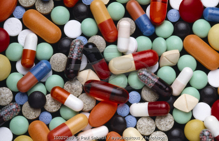 Health, Medicine, Medication, Mixed collection of colourful pills capsules and tablets.