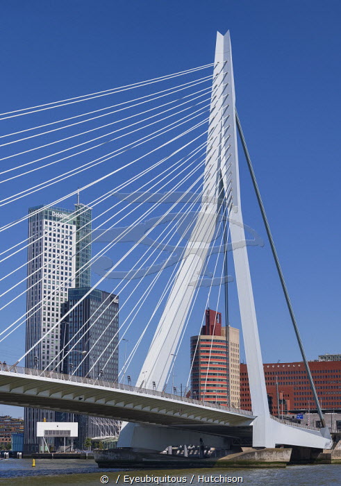 Holland, Rotterdam, View from underneath the Erasmusbrug or Erasmus Bridge over the Nieuwe Maas River with the Maastoren which is Holland's second highest building in the background.