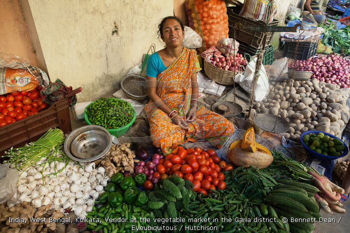 India, West Bengal, Kolkata, Vendor at the vegetable market in the Garia district.