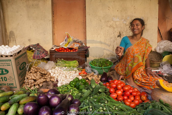 India, West Bengal, Kolkata, Vendor at the vegetable market in the Garia district.