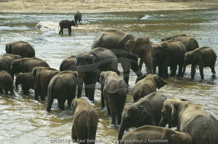 Indian Elephant herd from orphanage sanctuary at Pinawella near Kandy bathe in the Maha Oya river Sri Lanka