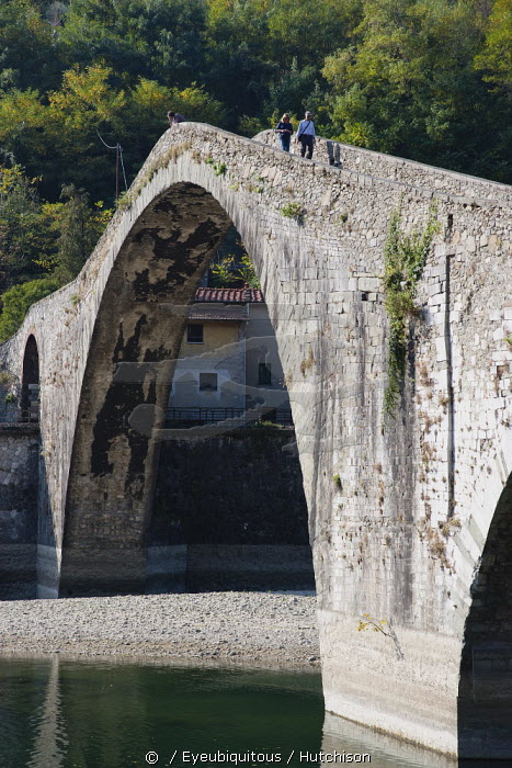 Italy, Tuscany, Lucca, Garfagnana, Bagni di Lucca, Devil's aka Maddalena's Bridge with people walking over the high arch