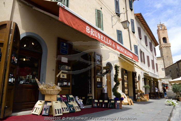 ITALY, Tuscany, Montalcino, Val D'Orcia Brunello di Montalcino Enoteca or wine shop with dispaly of boxed wines on the pavement around its entrance beneath a sunshade. The 14 the Century belltower of the Palazzo Comunale is at the end of the street.