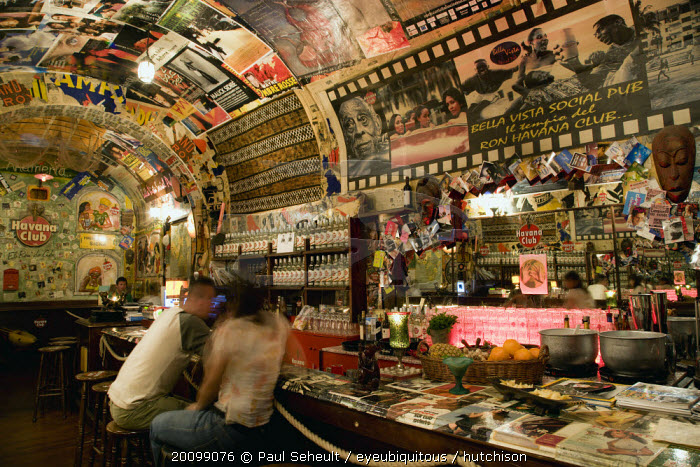 ITALY, Tuscany, Siena, The Bella Vista Social Pub Cuban theme bar interior with people sitting on stools at the bar counter.