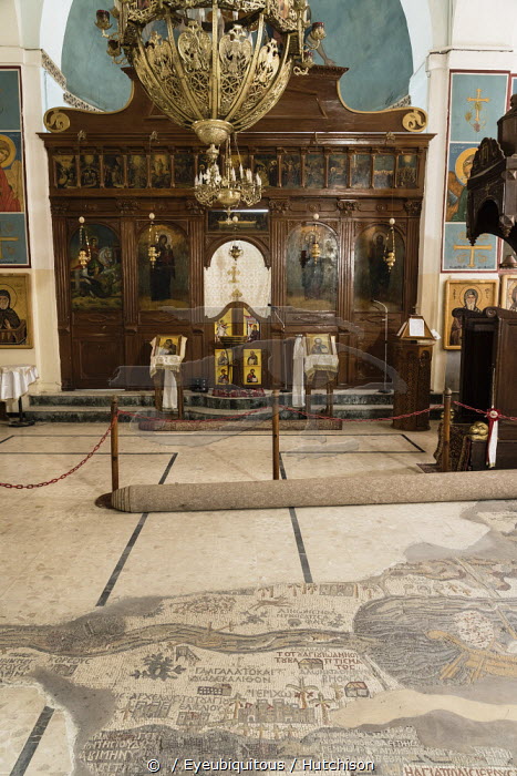 Jordan, Madaba, The famous mosaic map of Palestine, called the Madaba Map, on the floor of the nave of St. George's Church. It was originally the floor of a Byzantine church and was crafted in 560 A.D. and is the oldest map of Palestine in existence.