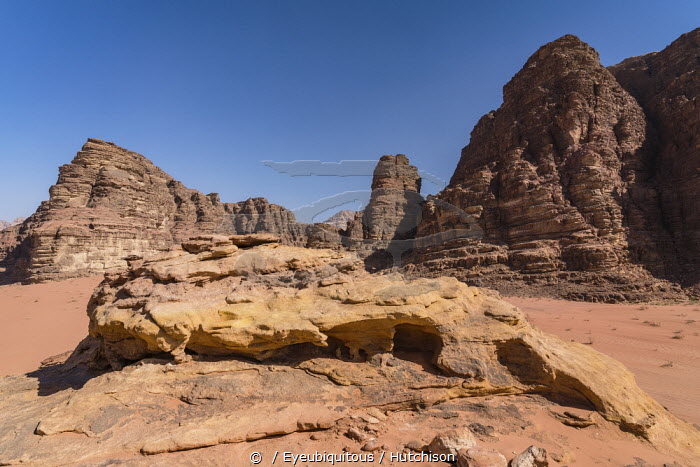 Jordan, Wadi Rum Protected Area, Desert sand and mountains in the Wadi Rum Protected Area, a UNESCO World Heritage Site. Um Sahn sandstone.