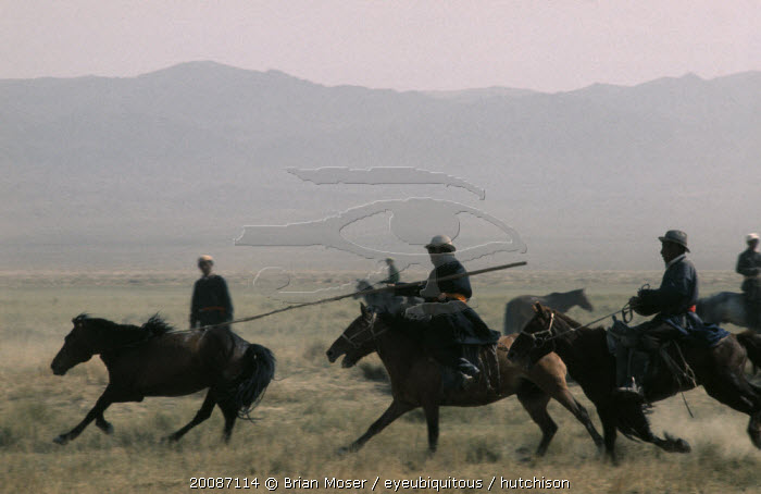 Khalkha horsemen galloping at full stretch to round up wild horses for breaking in using long lassoe poles.