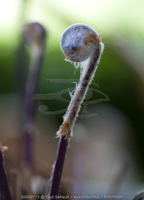 Landscape, Gardens, Plants, Unfurled frond or leaf of Osmunda regalis Royal Fern or Flowering Fern a deciduous herbaceous plant now rare due to wetland drainage.