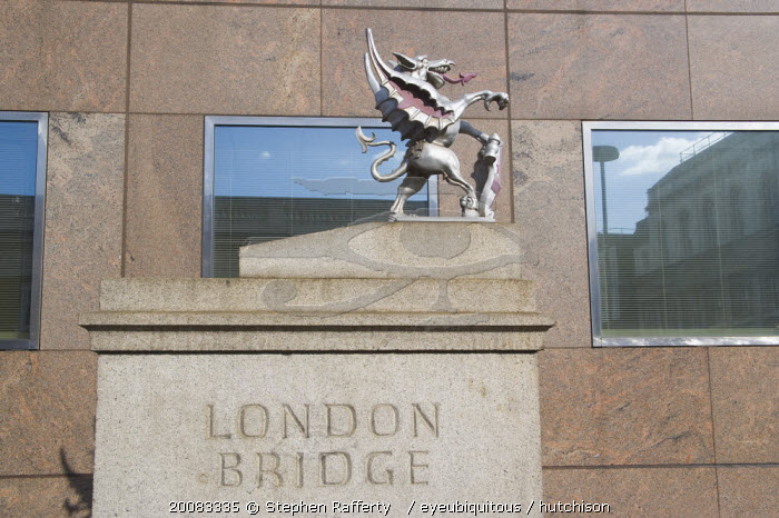 London Bridge detail with statue of Griffin on the Southwark side. Griffins mark the historical city boundary and are where travellers paid their tolls.United Kingdom Great Britain UK