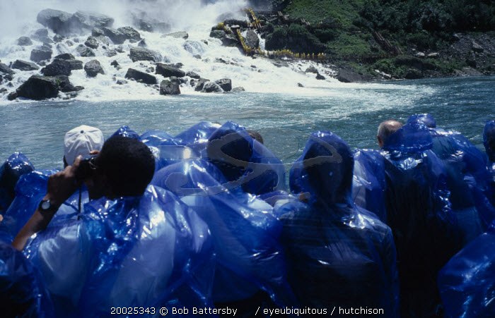 Maid of the Mists tourists in blue waterproofs looking toward American Falls