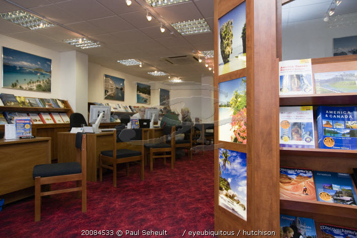 Male and female customer in a Travel Agents office discussing their holiday arrangements with a female travel consultant with travel brochures on shelves in the foregroundEuropean Great Britain Northern Europe UK United Kingdom British Isles