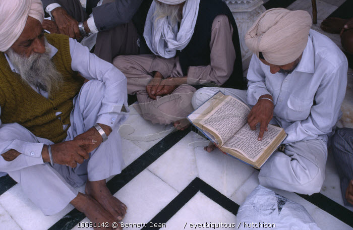 Men reading Sikh holy book at Golden Temple.Asia Asian Bharat Inde Indian Intiya Religion Religion Religious Sihism Sikhs Asia Asian Bharat Inde Indian Intiya Religion Religion Religious Sihism Sikhs