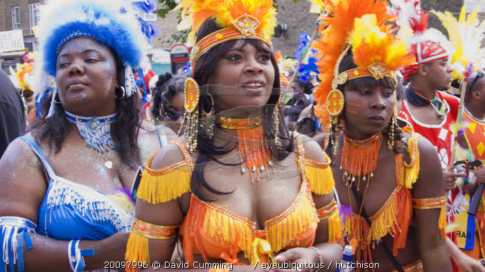 Nottinghill Carnival revellers in colourful costumes.Colorful European Great Britain Holidaymakers Londres Northern Europe Tourism Tourist UK United Kingdom British Isles Sightseeing Tourists